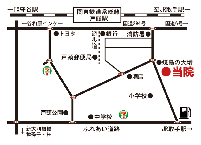 「谷和原インター」料金所を出たら「取手・守谷方面」に向かって、車で約20分
